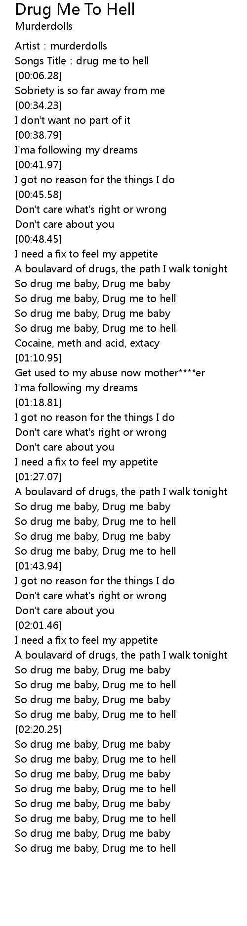 | [00:02.84] | Songs Title: drug me to hell |