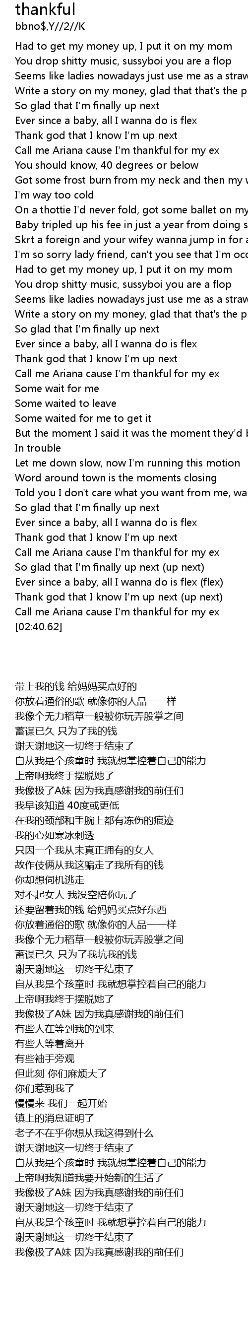 | [02:36.78] | Call me Ariana cause I'm thankful for my ex |