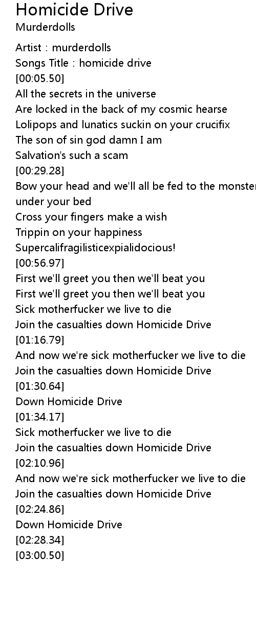 | [01:25.84] | Join the casualties down Homicide Drive |