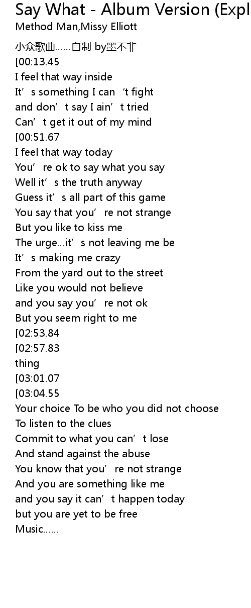 | [03:08.46][02:53.84][01:48.36] | Say what you say nothing |