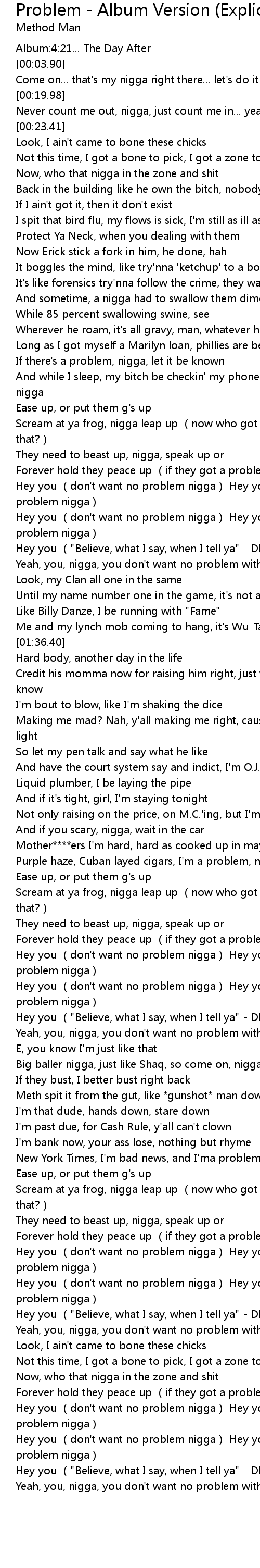 | [03:19.35] | Hey you don' t want no problem nigga Hey you don' t want no problem nigga |