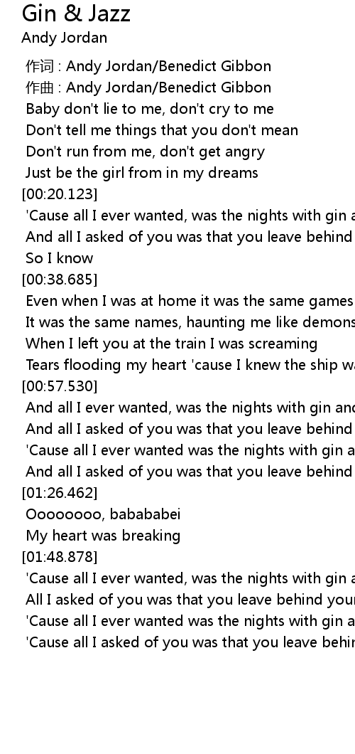 | [00:22.275] | ' Cause all I ever wanted, was the nights with gin and jazz |
