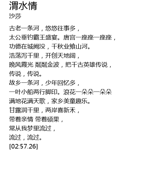 | [01:59.18] | 故乡一条河,少年回忆多, |