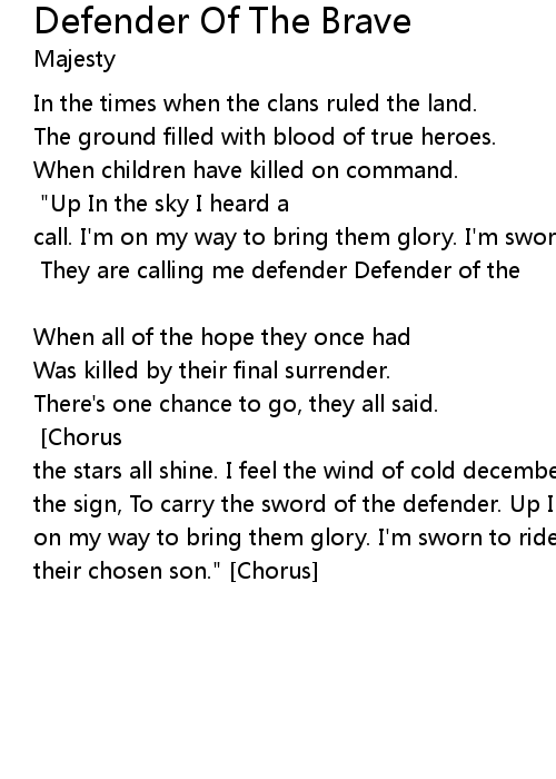 The lord of the damned brought them nightfall. [Bridge] "Up In the sky I heard a call. I'm on my way to bring them glory. I'm sworn to ride Until I fall. I am the one, their chosen son. [Chorus] They are calling me defender Defender of the brave Never I surrender My mission is to stay." [Verse 2] |
