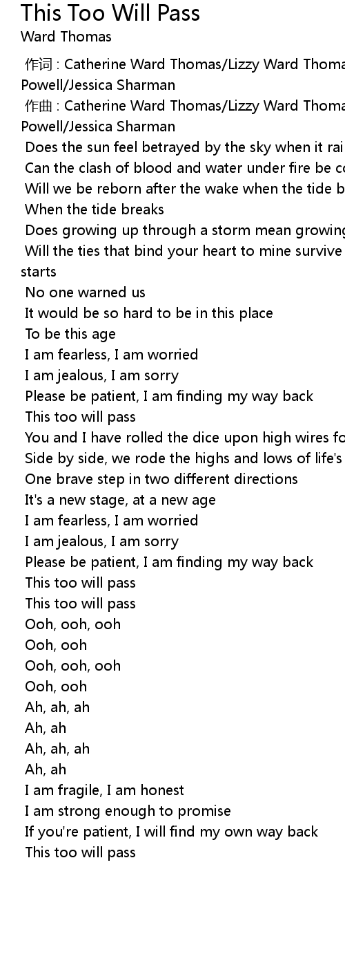| [00:00.000] | 作词 : Catherine Ward Thomas/Lizzy Ward Thomas/Rebekah Powell/Jessica Sharman |
