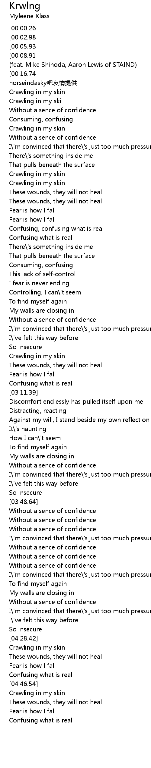 | [04:46.79] | Crawling in my skin |