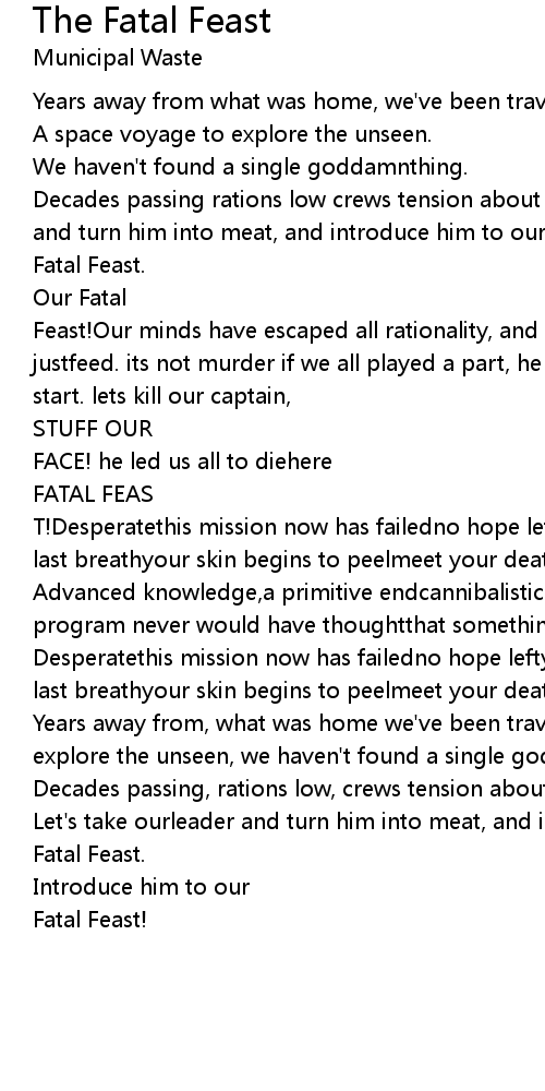Feast!Our minds have escaped all rationality, and all they want to do is justfeed. its not murder if we all played a part, he had it coming from thevery start. lets kill our captain, |