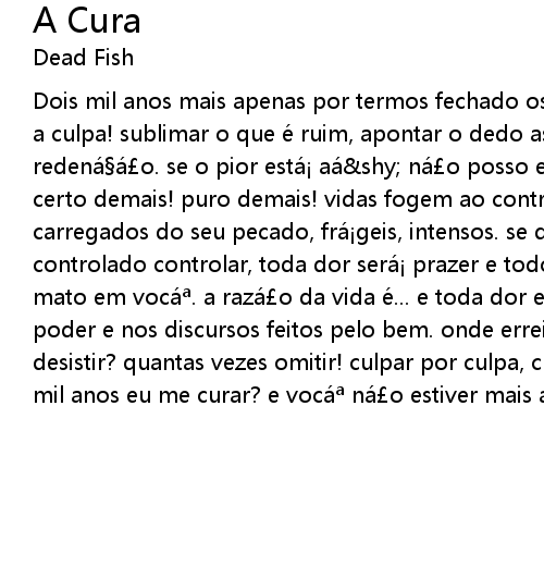 | Dois mil anos mais apenas por termos fechado os olhos algumas vezes, ate quando a culpa! sublimar o que e ruim, apontar o dedo assim, acreditar na redenaa o. se o pior esta aa shy na o posso estar em seu lugar, certo demais! puro demais! vidas fogem ao controle com as armas os beijos, carregados do seu pecado, fra geis, intensos. se deleguei o meu poder, controlado controlar, toda dor sera prazer e todo orgulho escondera que me mato em voca. a raza o da vida e... e toda dor e todo prazer e todo sexo e poder e nos discursos feitos pelo bem. onde errei!? quantas vezes vamos desistir? quantas vezes omitir! culpar por culpa, curar sem cura. e se em dois mil anos eu me curar? e voca na o estiver mais aqui... |