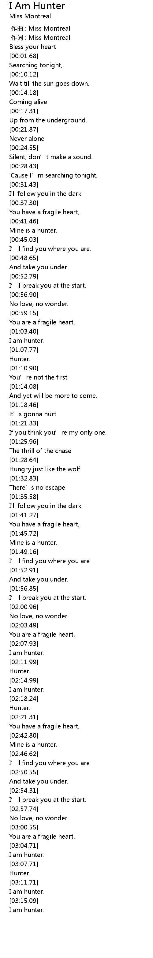 | [03:05.65] | I am hunter. |
