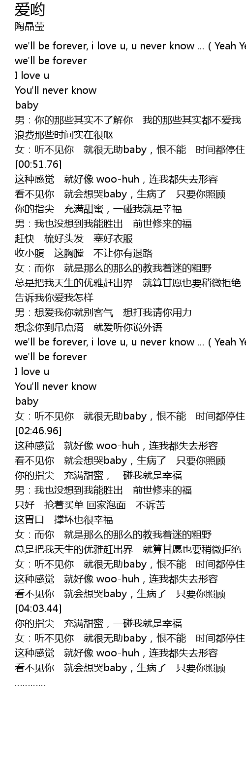 | [02:19.99] | 女:听不见你 就很无助baby,恨不能 时间都停住 |