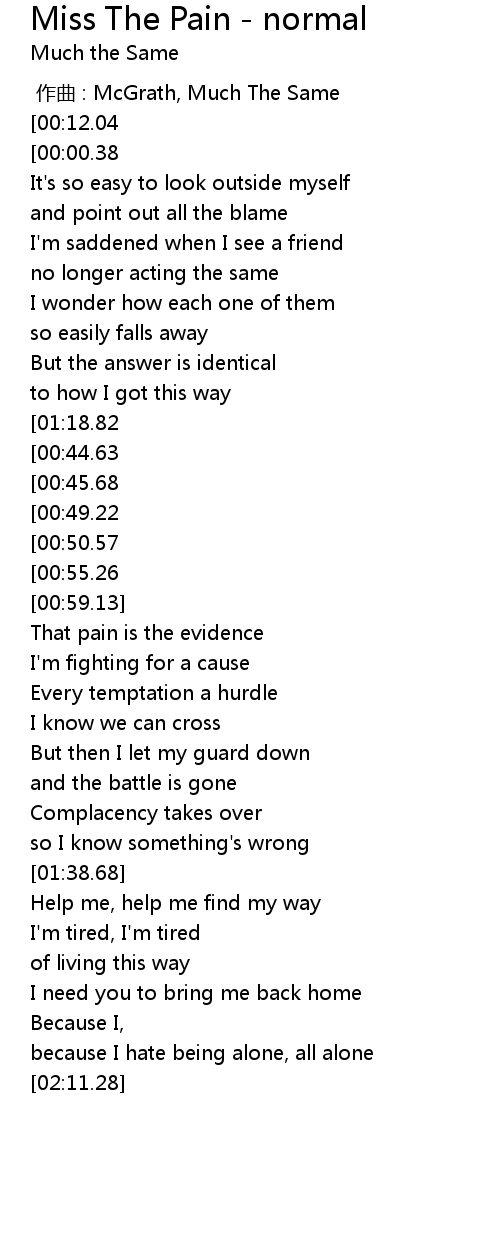 | [01:32.77][00:55.26] | And sometimes I miss the pain |