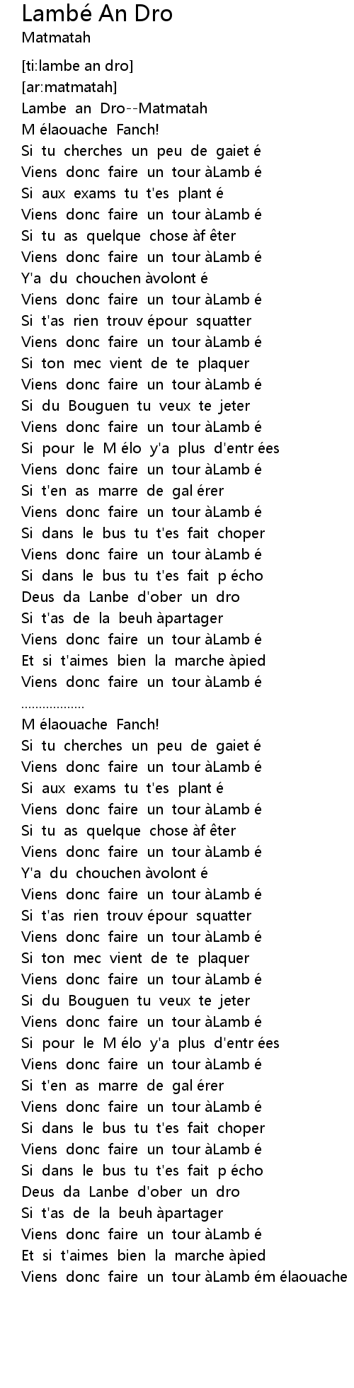 | [02:29.404] | Viens donc faire un tour à Lamb é |