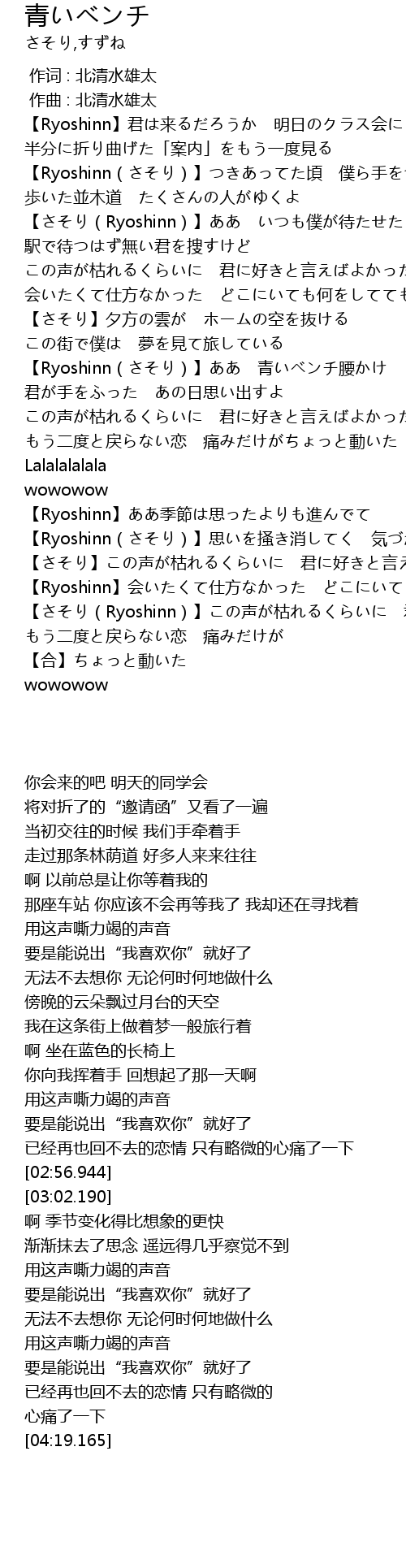 | [02:14.197] | 【Ryoshinn(さそり)】ああ 青いベンチ腰かけ |