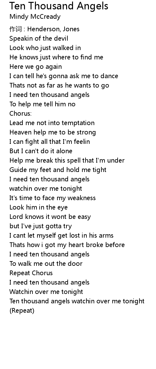 | Ten thousand angels watchin over me tonight | |