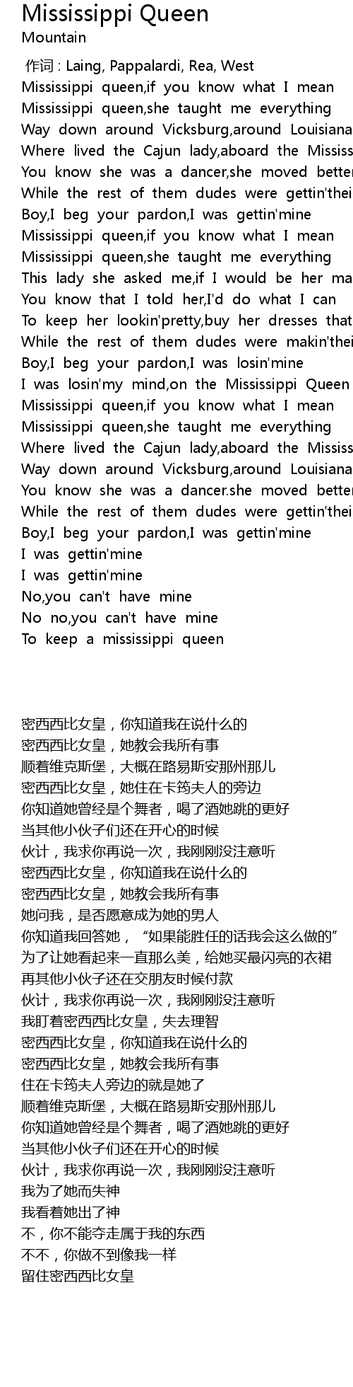 | [00:19.179] | Mississippi queen,if you know what I mean |