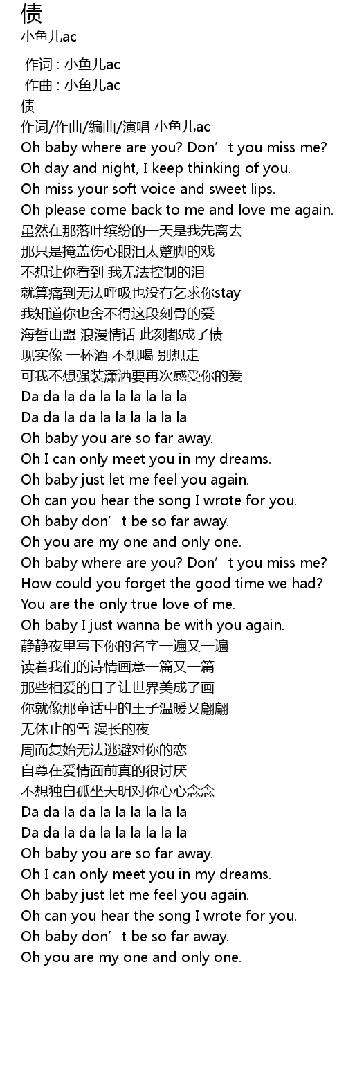 | [00:30.173] | 作词/作曲/编曲/演唱 小鱼儿ac |