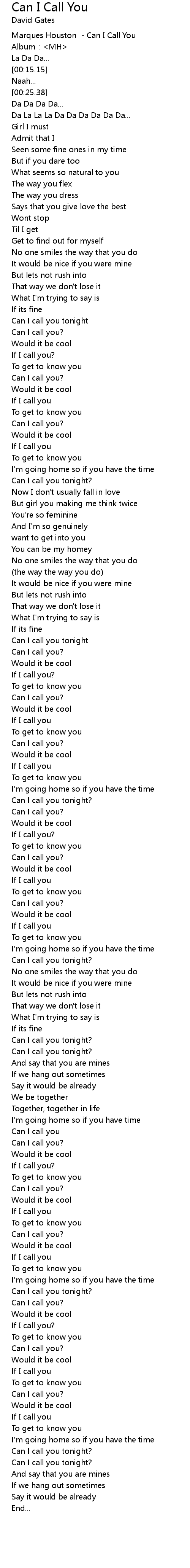 | [00:00.01] | Marques Houston - Can I Call You |