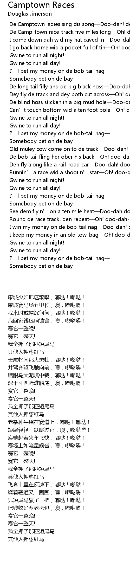 | [00:47.324] | Dey fly de track and dey both cut across Oh! doodahday! |