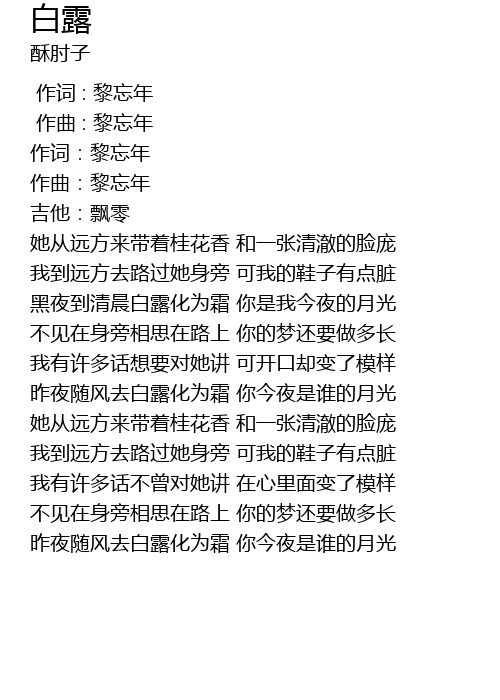 | [00:44.258] | 黑夜到清晨白露化为霜 你是我今夜的月光 |