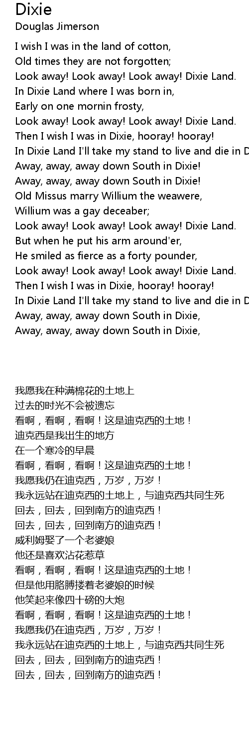 In Dixie Land I'll take my stand to live and die in Dixie, |
