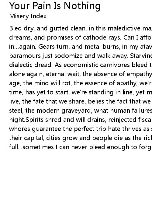 | Bled dry, and gutted clean, in this maledictive maze. Assembly lines are full of dreams, and promises of cathode rays. Can I afford a life? The walls are caving in again. Gears turn, and metal burns, in my atavistic daze. Their pacifistic paramours just sodomize and walk away. Starving hearts and hollow heads, in dialectic dread. As economistic carnivores bleed the population red. Standing alone again, eternal wait, the absence of empathy, so out of date, the body will age, the mind will rot, the essence of apathy, we' re parasites, the ending of time, has yet to start, we' re standing in line, yet miles apart, our will to live, the fate that we share, belies the fact that we neve care. Caves of raw steel, the modern graveyard, what human failures promise for us, day turns into night. Spirits shred and will drains, reinjected fiscal fix cash gods and money whores guarantee the perfect trip hate thrives as stressed lives, cultivate their capital, cities grow and people die as the rich stuff their guts full... sometimes I can never bleed enough to forget that I' m alive... |