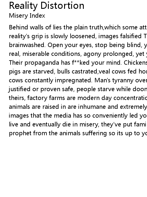Behind walls of lies the plain truth,which some attempt to deny and hide, reality's grip is slowly loosened, images falsified The media shit has you brainwashed. Open your eyes, stop being blind, you clearly see the horrors are real, miserable conditions, agony prolonged, yet you ignore the pain they feel. Their propaganda has f**ked your mind. Chickens debeaked, chicks are smothered, pigs are starved, bulls castrated,veal cows fed hormones, antibiotics, female cows constantly impregnated. Man's tyranny over other living beings cannot be justified or proven safe, people starve while doomed cows eat what could be theirs, factory farms are modern day concentration camps. The conditions these animals are raised in are inhumane and extremely cruel, forget these fairytale images that the media has so conveniently led you to beleive, they are reared to live and eventually die in misery, they've put family farms out of business, you prophet from the animals suffering so its up to you and I to stop the torture!!! |