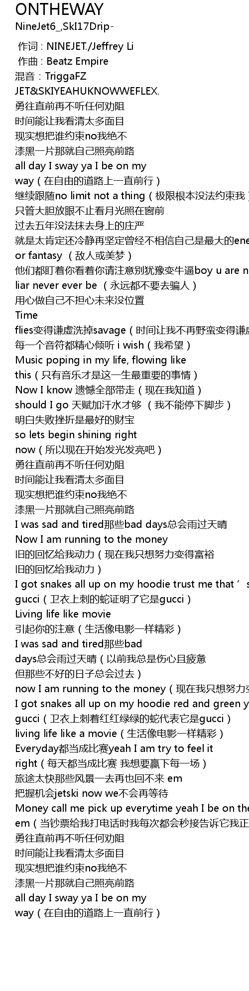 | [02:10.198] | Money call me pick up everytime yeah I be on the way em dāng chāo piào gěi wǒ dǎ diàn huà shí wǒ měi cì dōu huì miǎo jiē gào sù tā wǒ zhèng zài lù shàng |