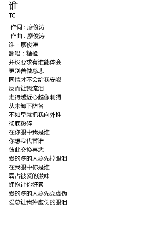 | [00:03.653] | 谁 - 廖俊涛 |