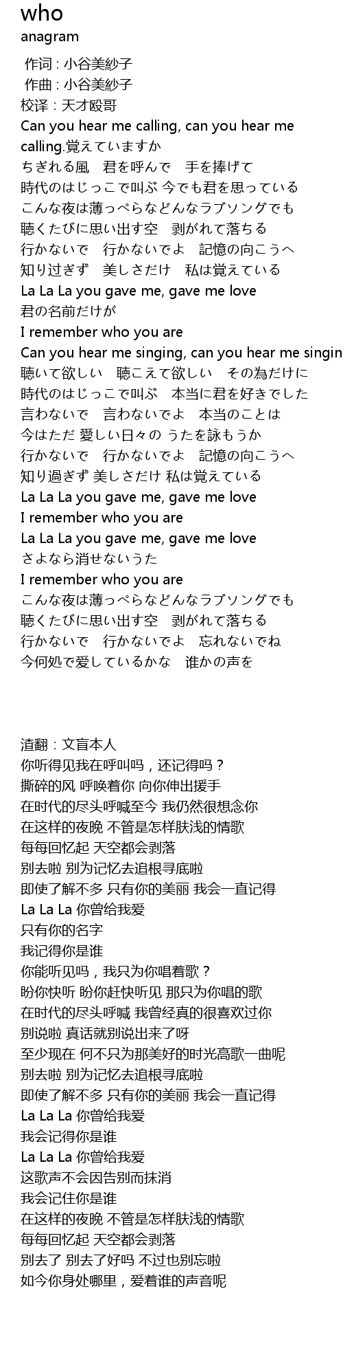 | [00:07.637] | Can you hear me calling, can you hear me calling.覚えていますか |