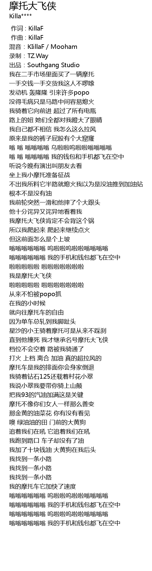 | [02:03.000] | 摩托车是我的排面你会身家倒退 |