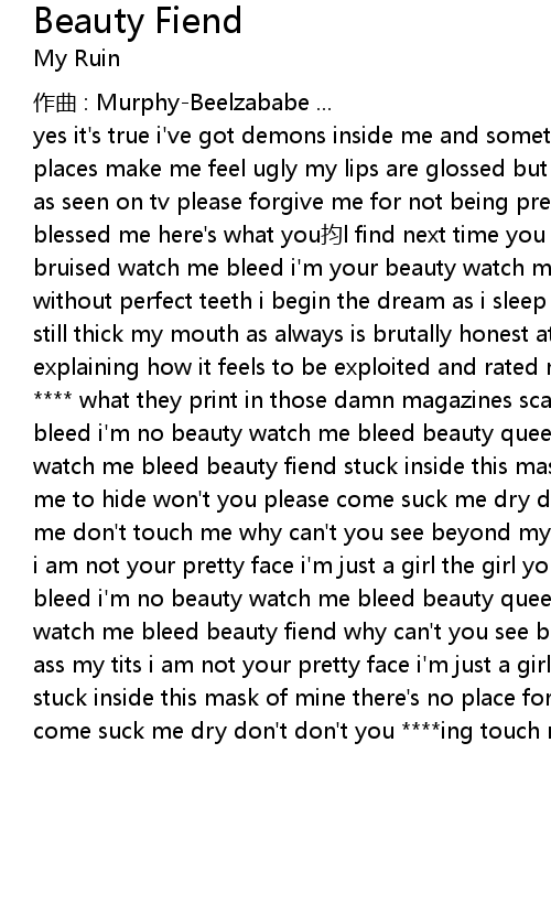 | yes it' s true i' ve got demons inside me and sometimes they need to speak my dark places make me feel ugly my lips are glossed but my heart is weak i' m diseased as seen on tv please forgive me for not being pretty or sexy but god never blessed me here' s what you yun l find next time you undress me scars wounds i' m bruised watch me bleed i' m your beauty watch me bleed beauty fiend once again without perfect teeth i begin the dream as i sleep soon i' ve sinned my skin is still thick my mouth as always is brutally honest at my calmest i' m tired of explaining how it feels to be exploited and rated number one, two or seventeen what they print in those damn magazines scars wounds i' m used watch me bleed i' m no beauty watch me bleed beauty queen watch me bleed i' m your beauty watch me bleed beauty fiend stuck inside this mask of mine there' s no place for me to hide won' t you please come suck me dry don' t touch me don' t ing touch me don' t touch me why can' t you see beyond my skin size my shape my ass my tits i am not your pretty face i' m just a girl the girl you love to hate watch me bleed i' m no beauty watch me bleed beauty queen watch me bleed i' m the beauty watch me bleed beauty fiend why can' t you see beyond my skin size my shape my ass my tits i am not your pretty face i' m just a girl the girl you love to hate stuck inside this mask of mine there' s no place for me to hide won' t you please come suck me dry don' t don' t you ing touch me pig |