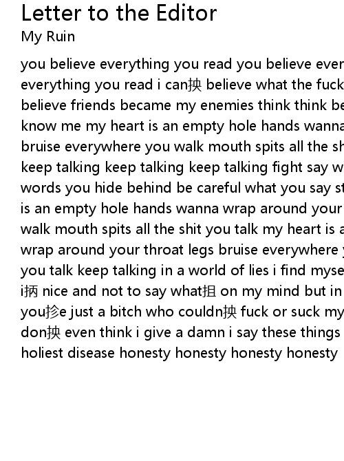 | you believe everything you read you believe everything you read you believe everything you read i can抰 believe what the fuck i read scream words that i believe friends became my enemies think think before you speak don抰 think you know me my heart is an empty hole hands wanna wrap around your throat legs bruise everywhere you walk mouth spits all the shit you talk so keep talking keep talking keep talking keep talking fight say what抯 on my mind (no i) lies words you hide behind be careful what you say stay stay the fuck away my heart is an empty hole hands wanna wrap around your throat legs bruise everywhere you walk mouth spits all the shit you talk my heart is an empty hole hands wanna wrap around your throat legs bruise everywhere you walk mouth spits all the shit you talk keep talking in a world of lies i find myself advised to just pretend i抦 nice and not to say what抯 on my mind but in a world of shit i think you抮e just a bitch who couldn抰 fuck or suck my dick cause i抦 a chick don抰 even think i give a damn i say these things because i can honesty is the holiest disease honesty honesty honesty honesty |