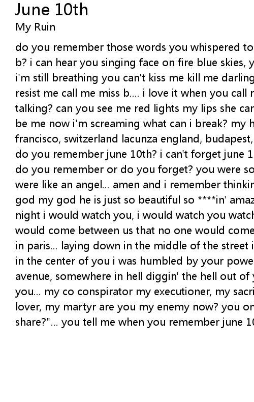 do you remember those words you whispered to me on that fateful day in italy mr. b? i can hear you singing face on fire blue skies, your eyes my beautiful liar i'm still breathing you can't kiss me kill me darling i know you miss me can't resist me call me miss b.... i love it when you call me miss b can you hear me talking? can you see me red lights my lips she can never be me... she can never be me now i'm screaming what can i break? my hearts broken... silverlake san francisco, switzerland lacunza england, budapest, mulhouse, june 10th june 10th do you remember june 10th? i can't forget june 10th.... i remember when we met do you remember or do you forget? you were so perfect, so pure like an angel you were like an angel... amen and i remember thinking, i remember thinking... my god my god he is just so beautiful so ****in' amazing and every night, every night i would watch you, i would watch you watching me and we swore that nothing would come between us that no one would come between us do you remember? ecstasy in paris... laying down in the middle of the street in the middle of the night in the center of you i was humbled by your power, on the 9th plane... 666 acacia avenue, somewhere in hell diggin' the hell out of you, diggin' the hell in you... my co conspirator my executioner, my sacrificial lamb, my friend, my lover, my martyr are you my enemy now? you once asked me" is existance all we share?"... you tell me when you remember june 10th, do you remember june 10th |