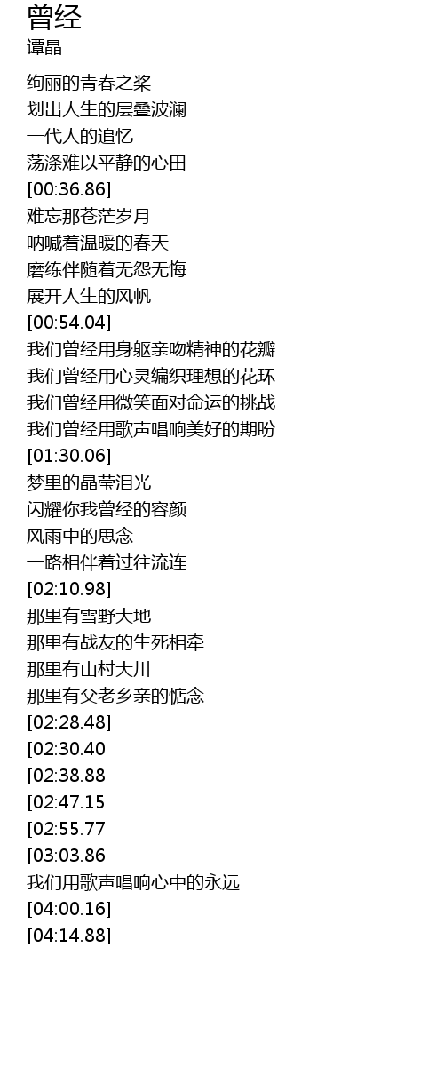 | [03:29.26][02:55.77] | 我们曾经用歌声唱响美好的期盼 |