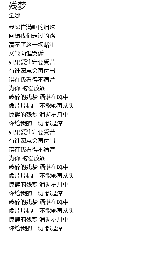 | [01:23.16] | 破碎的残梦 洒落在风中 |