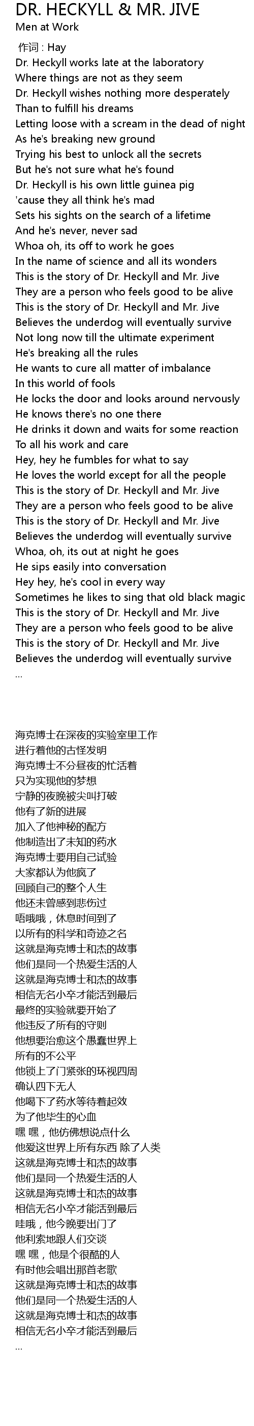 | [02:29.846] | This is the story of Dr. Heckyll and Mr. Jive |