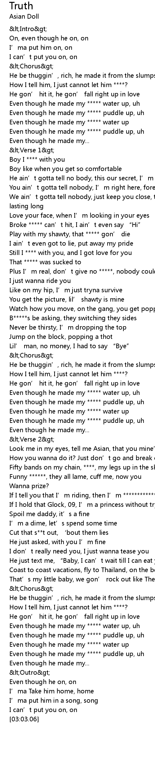 | [00:34.40] | Even though he made my ***** puddle up, uh |
