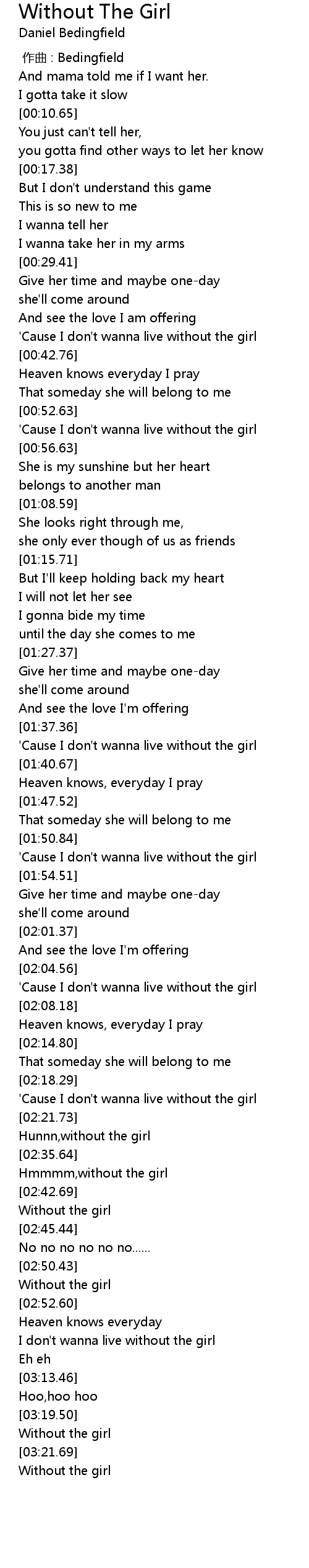 | [01:37.98] | ' Cause I don' t wanna live without the girl |