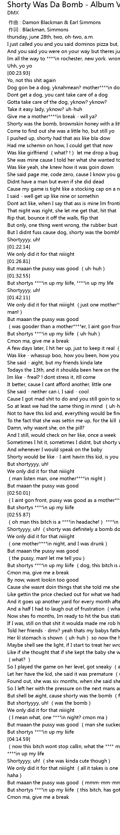 | [03:36.33] | Told her friends dmx? yeah thats my babys father uhoh |
