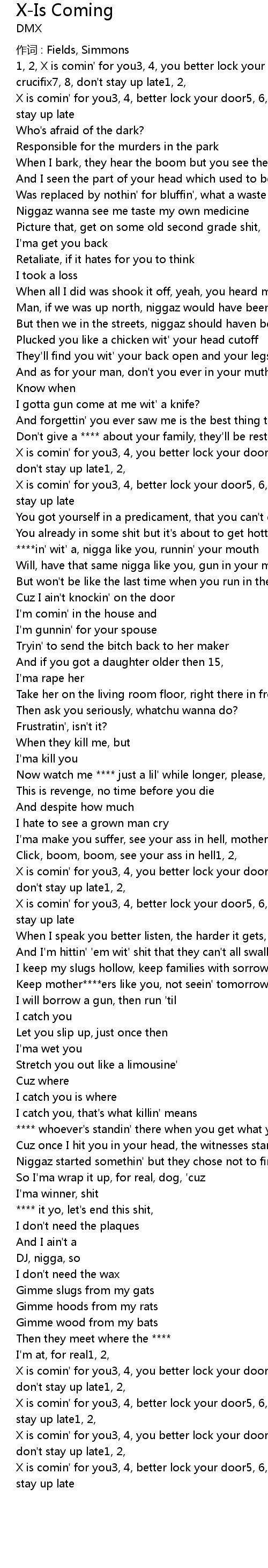 | X is comin' for you3, 4, you better lock your door5, 6, get your crucifix7, 8, don' t stay up late1, 2, | |