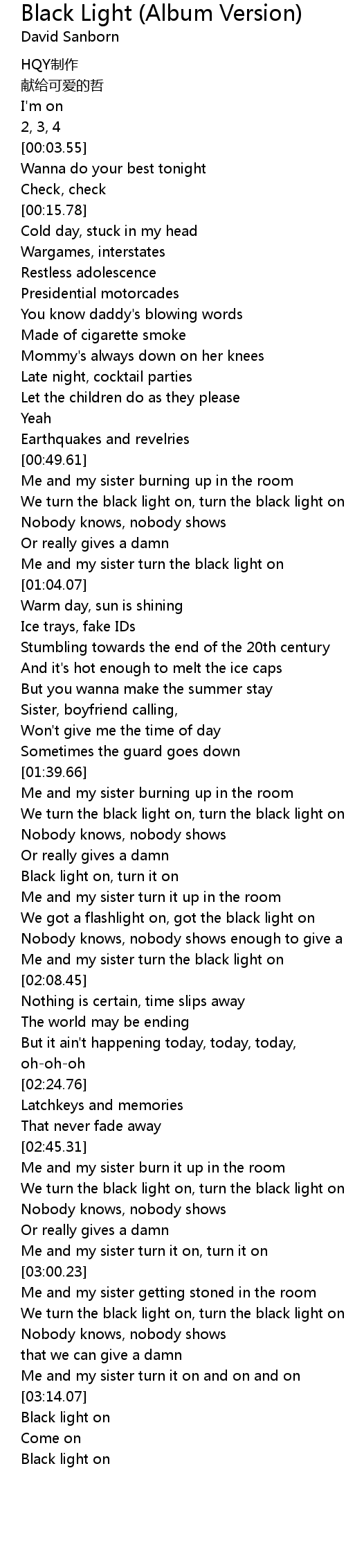 | [03:03.38] | We turn the black light on, turn the black light on |