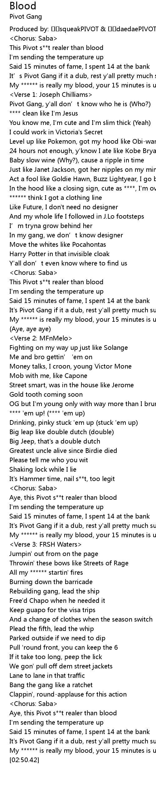 | [02:32.11] | Aye, this Pivot s**t realer than blood |