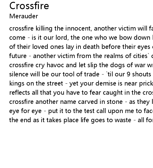 crossfire killing the innocent, another victim will fall who said their time has come - is it our lord, the one who we bow down before parents crying, the life of their loved ones lay in death before their eyes casket bears a child of our future - another victim from the realms of cities` crimes caught in the crossfire cry havoc and let slip the dogs of war wrong us and face our revenge silence will be our tool of trade - `til our 9 shouts out you`re the king of kings on the street - yet your demise is near prick us, do we not bleed mirror reflects all that you have to fear caught in the crossfire caught in the crossfire another name carved in stone - as they lay to rest blood for blood, eye for eye - put it to the test call upon me to face the strike - seeing you in the end as it takes place life goes to waste - all for revenge |