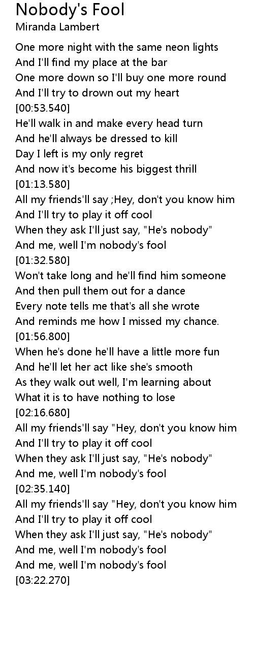 | [03:11.440] | And me, well I' m nobody' s fool |