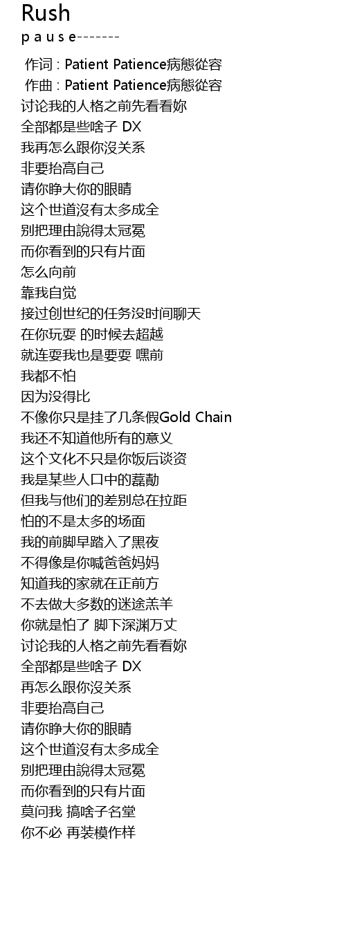 | [00:00.000] | 作词 : Patient Patience病態從容 |