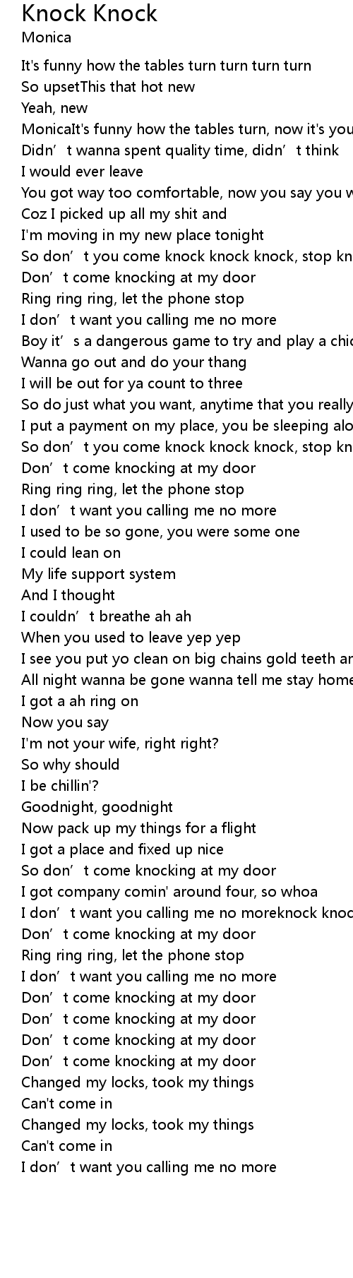 | I don’t want you calling me no moreknock knock knock, stop knocking | |
