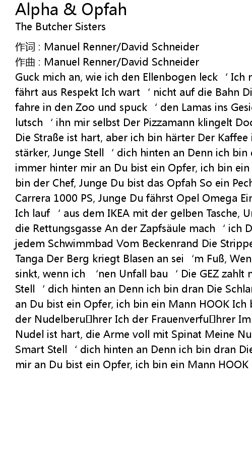| Ich lauf' aus dem IKEA mit der gelben Tasche, Und fahre dann nach Hause Durch die Rettungsgasse An der Zapfs ule mach' ich Die Kippe an Und spring' in jedem Schwimmbad Vom Beckenrand Die Stripperin steckt mir die Scheine in den Tanga Der Berg kriegt Blasen an sei' m Fu, Wenn ich wander' Die Pr mie sinkt, wenn ich ' nen Unfall bau' Die GEZ zahlt mir monatlich den Beitrag aus Stell' dich hinten an Denn ich bin dran Die Schlange f ngt immer hinter mir an Du bist ein Opfer, ich bin ein Mann HOOK Ich bin der Rudelfu hrer, du bist der Nudelberu hrer Ich der Frauenverfu hrer Immer rauf auf die Hu hner Die Nudel ist hart, die Arme voll mit Spinat Meine Nudel ein Benz, deine Nudel ein Smart Stell' dich hinten an Denn ich bin dran Die Schlange f ngt immer hinter mir an Du bist ein Opfer, ich bin ein Mann HOOK |