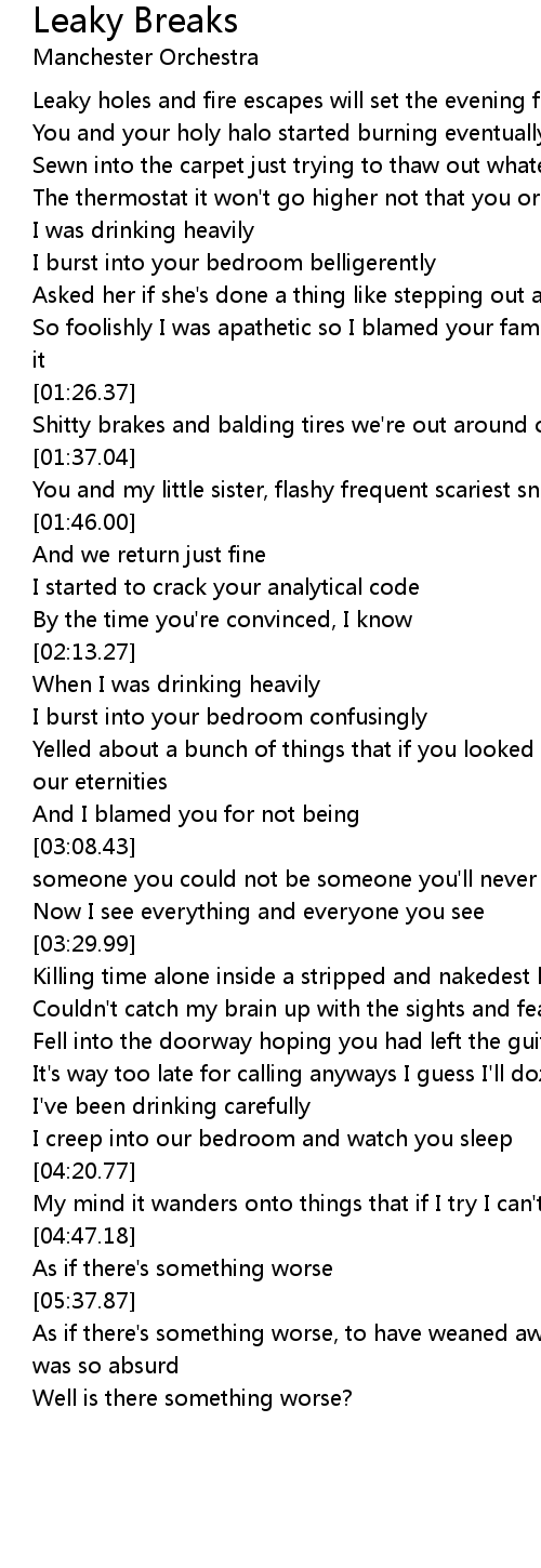 [00:22.08] Leaky holes and fire escapes will set the evening for tone