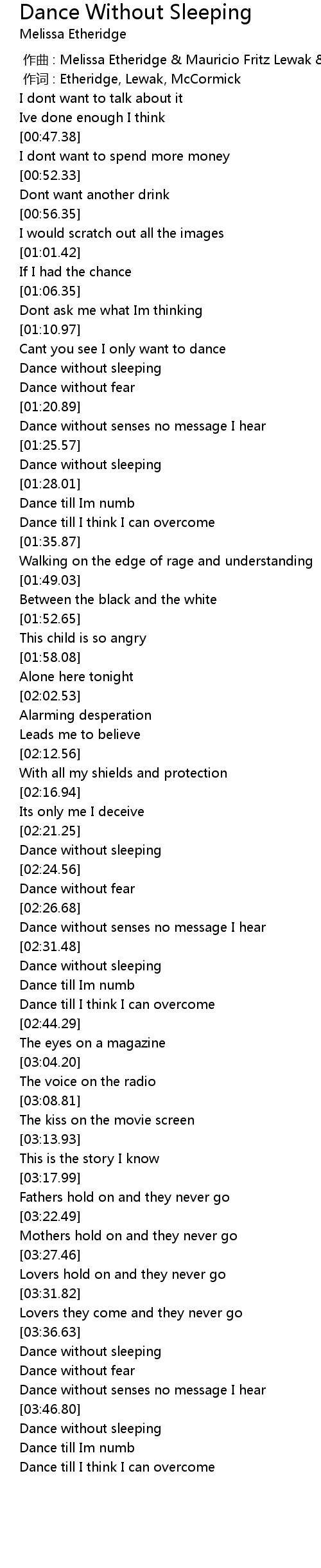 | [00:00.00] | zuò qǔ : Melissa Etheridge Mauricio Fritz Lewak Kevin McCormick |