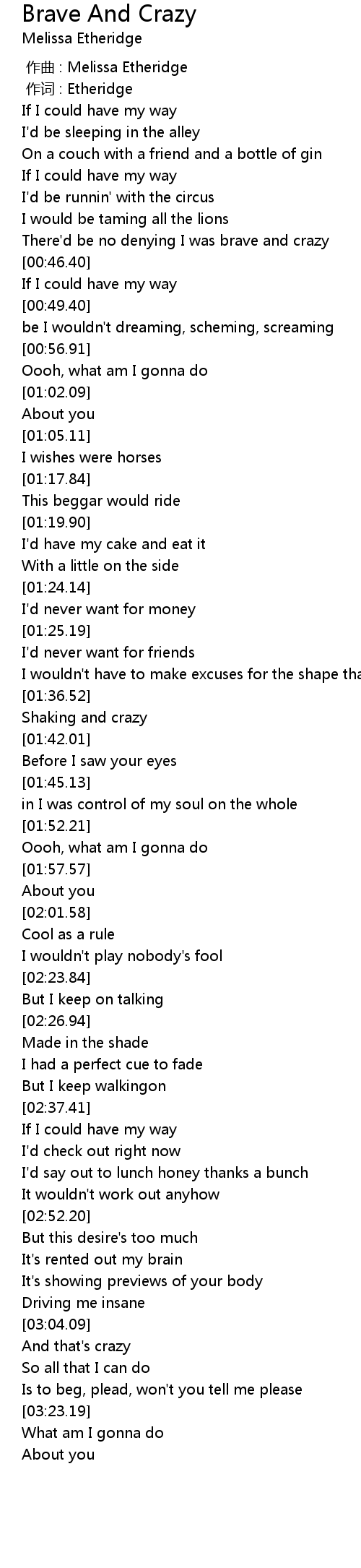 | [00:36.49] | There'd be no denying I was brave and crazy |